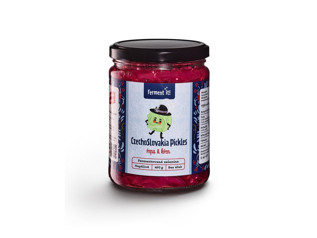 Pickles Czechoslovakia je fermentované křupavé zelí s mrkví, červenou řepou a křenem, jemně doplněné fenyklovými semínky pro tradiční, výraznou a lahodně kořeněnou chuť. Skvěle fungují k masu (vepřové, hovězí, pečené kuře, sekaná), k uzeninám a zabijačkovým jídlům, k řízkům a karbanátkům, k bramborám na všechny způsoby (vařené, kaše, pečené), k luštěninám a čočce, ke chlebíčkům a sendvičům, k paštikám a sýrům, k vajíčkům, nebo jako kyselý kontrast k hutným omáčkám.